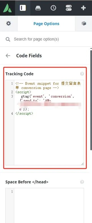 继续返回到Wordpress网站后台,找到刚才创建的感谢单页面-进入Live Builder在线编辑-左侧栏找到Page Options-Code Fields-Tracking Code在里面将刚才复制的转化代码添加到里面。