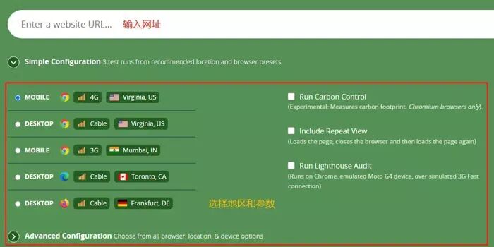 ① 使用Webpagetest 免费版在线测试工具,可以选择具体的国家地点,以及浏览器等,然后测试页面加载速度。